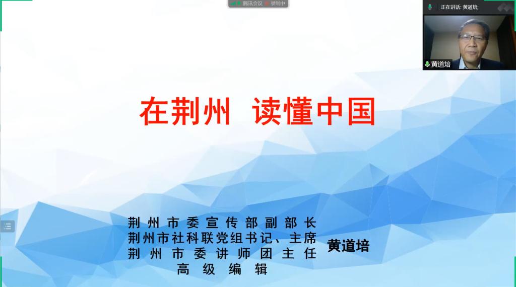 (文 张晓燕 图 张夕雨)由长江探觅荆州,在荆州读懂中国。10月19日晚,《生命长江》第八季第五讲在腾讯会议如期开讲。本讲主题为“在荆州读懂中国”,荆州市委宣传部副部长黄道培为同学们带来精彩讲授。