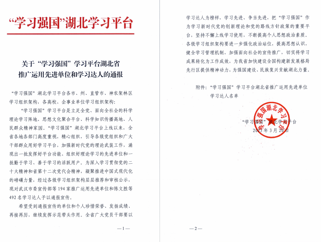 近日,湖北省委宣传部表彰了一批 “学习强国”学习平台推广运用先进单位和学习达人,成人色情网