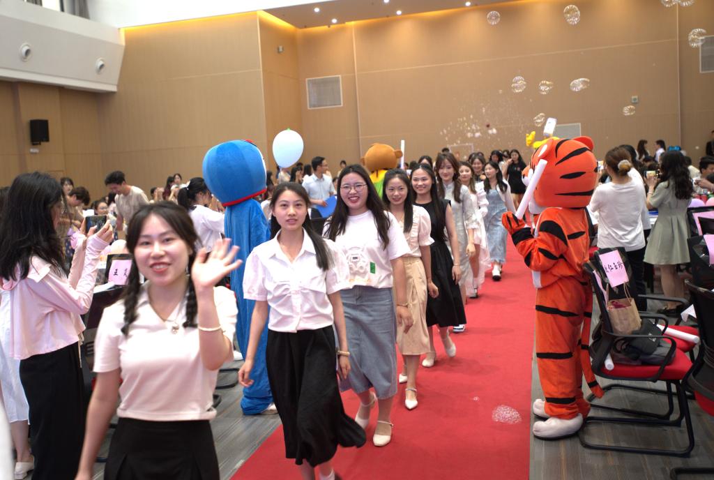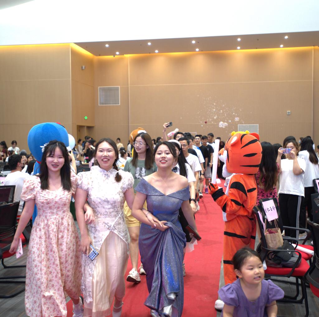 动感的音乐渲染出欢快的氛围,在鲜花、气球与相机灯中,2023届毕业生们华丽登场,自信放光芒,在师生的欢呼声与掌声中穿越红毯,为自己的大学青春做浪漫告别。学院还专门为毕业生设席,准备丰富的水果、小吃、饮料以及纯洁美丽的栀子花。毕业生们在毕业仪式中收获满满惊喜与感动。