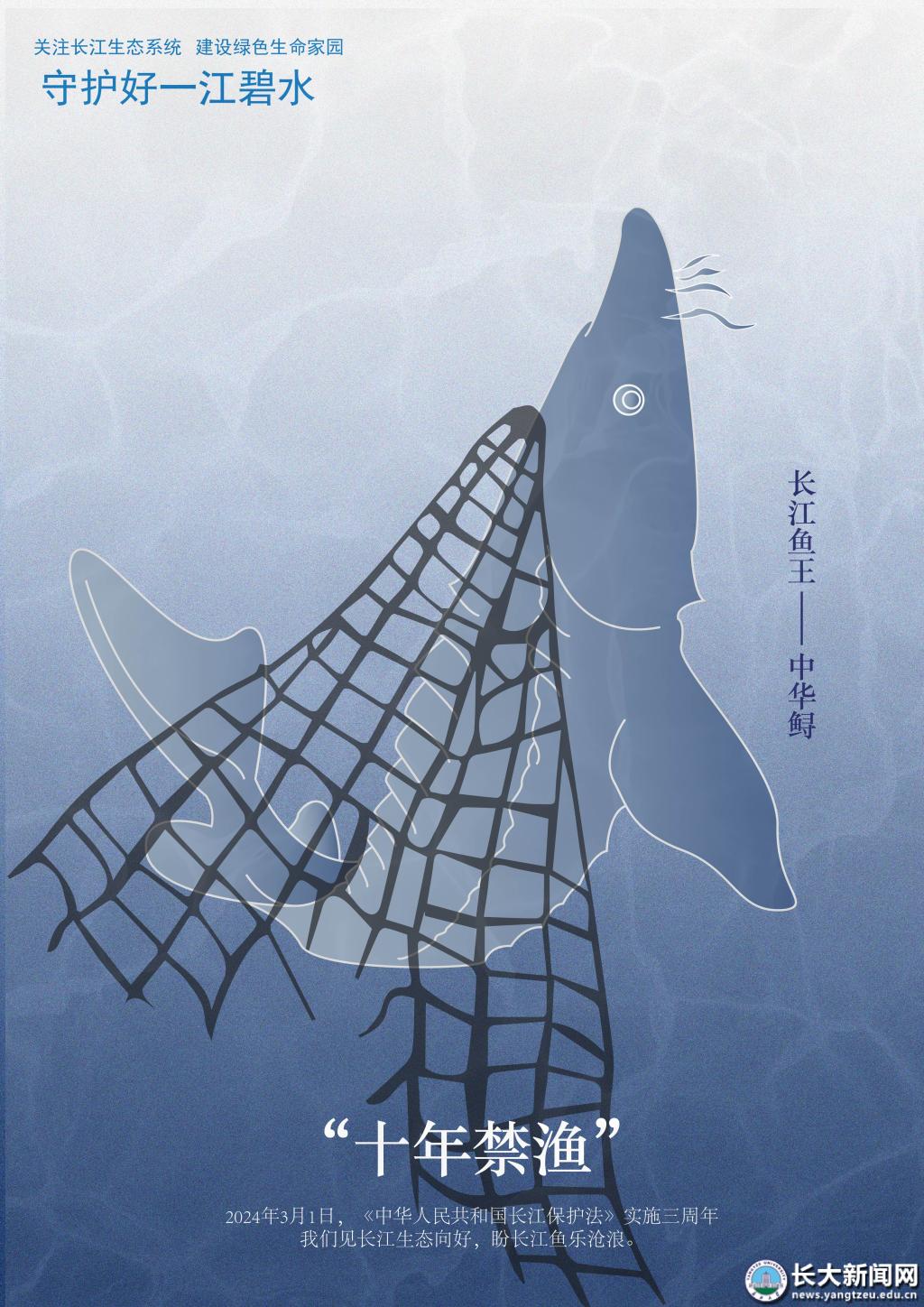 2023级研究生王悦悦创作。画面以“长江鱼王”中华鲟挣脱渔网的姿态,纪念《中华人民共和国长江保护法》实施三周年。作品借简洁视觉语言,传递出守护一江碧水,期盼长江生态持续向好,人与自然和谐共生的美好愿景,彰显了青年学子以创意助力生态保护的担当。