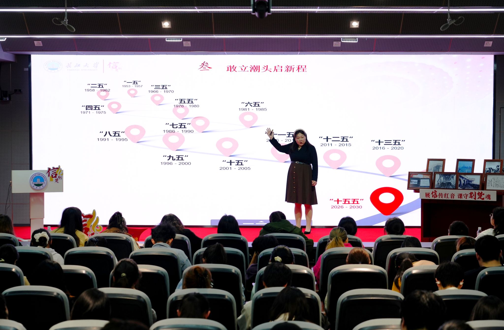 青年教师郭辉以《见字如晤,大道如虹——山海寻梦楚天阔》为题,与学生代表马绮悦、杨红妹等联袂讲授课程。课程以陕西省澄城中学初二乙团分支给苏联专家西林的信和周松年给儿子周璞的家书为引,透过一封封“写给山河的信”,带领同学们见证湖北交通从近代铁路艰难起步,到“一五”计划天堑变通途,再到“十五五”规划新时代蓝图的恢宏图景。