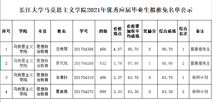 经学生本人申请、学院推免生遴选工作小组考核,现将成人色情网 2021届思想政治教育专业优秀应届本科毕业生免试攻读硕士学位研究生名单予以公示。公示时间:2020年9月24日-2019年9月25日,公示期间学生如有异议可向学院、教务处反映,如有违纪,可向学校纪委举报。联系电话:学院(0716)8060733,教务处(0716)8060580,学校纪委(0716)8060993。