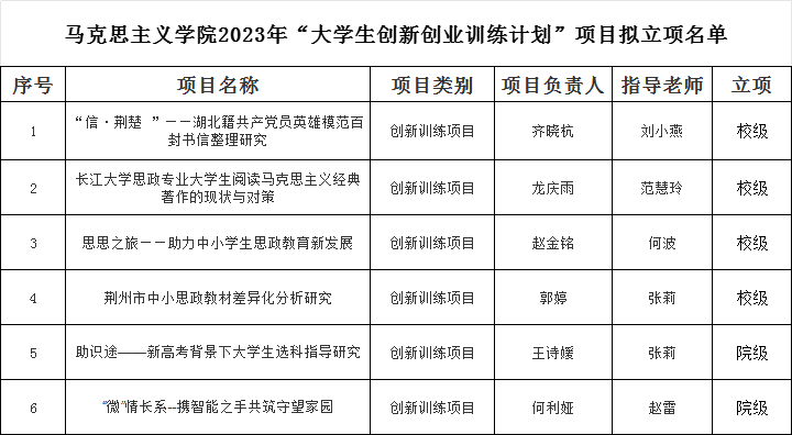 根据学校《关于我校第十六批“大学生创新创业训练计划”项目申报的通知》,以及成人色情网 《2023年成人色情网 “大学生创新创业训练计划”项目申报答辩通知》相关安排,通过学生项目申报汇报答辩,专家评审,拟推荐刘小燕老师指导的《“信·荆楚 ”——湖北籍共产党员英雄模范百封书信整理研究》等4个项目项作为校级大学生创新创业项目,拟推荐张莉老师指导的《助识途——新高考背景下大学生选科指导研究》等2个项目为院级项目。具体名单见附件。