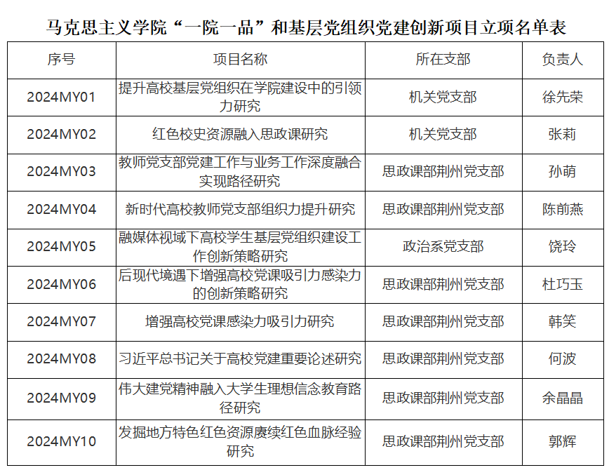 7个党支部组织推荐申报了14个党建研究项目。经学校评审,共有1个重点项目、3个一般项目获评立项。经学院党委会研究决定,将校级未立项的10个项目列为院级党建项目予以立项。现将名单公示如下: