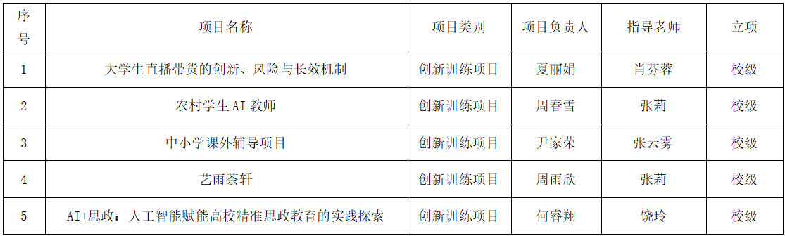 根据学校《关于我校第十八批“大学生创新创业训练计划”项目申报的通知》,以及成人色情网 《2025年成人色情网 “大学生创新创业训练计划”项目申报答辩通知》相关安排,通过学生项目申报汇报答辩,专家评审,拟推荐肖芬蓉老师指导的《大学生直播带货的创新、风险与长效机制》等5个项目作为校级大学生创新创业项目,具体名单见附件。