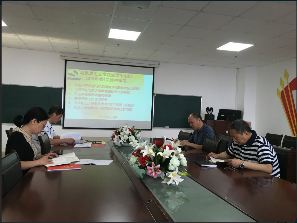 于2018 年5月9日在文科楼1104室举行了党委理论学习中心组第四次集中学习,会议由党总支书记吴智勇主持。