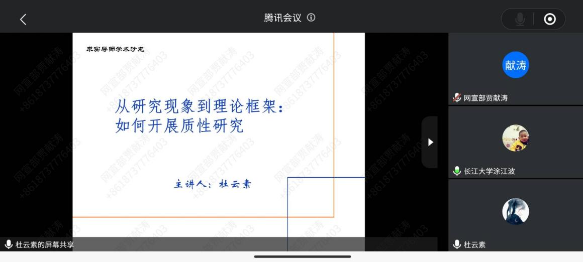 会上,杜云素从定性研究和定量研究的区别和对象选择入手讲授了质性研究的适用范围;以自己的亲身经历告诫同学们要锚定和围绕“研究空地”,选定理论视角,明确研究内容,界定核心概念,拟定关键问题的方法做质性研究设计;用阅读文本、撰写笔记、分类思考、互相讨论、头脑风暴等方法进行资料分析;并通过郑丹丹教授论文中的质性研究案例强调理论在质性研究中的重要作用。在提问环节,她细心解答同学们提出的调查问卷前期准备工作等相关问题,建议同学们以调查问卷的研究方法为主,明确中心概念,利用概念图示理顺逻辑,辅助研究和写作。