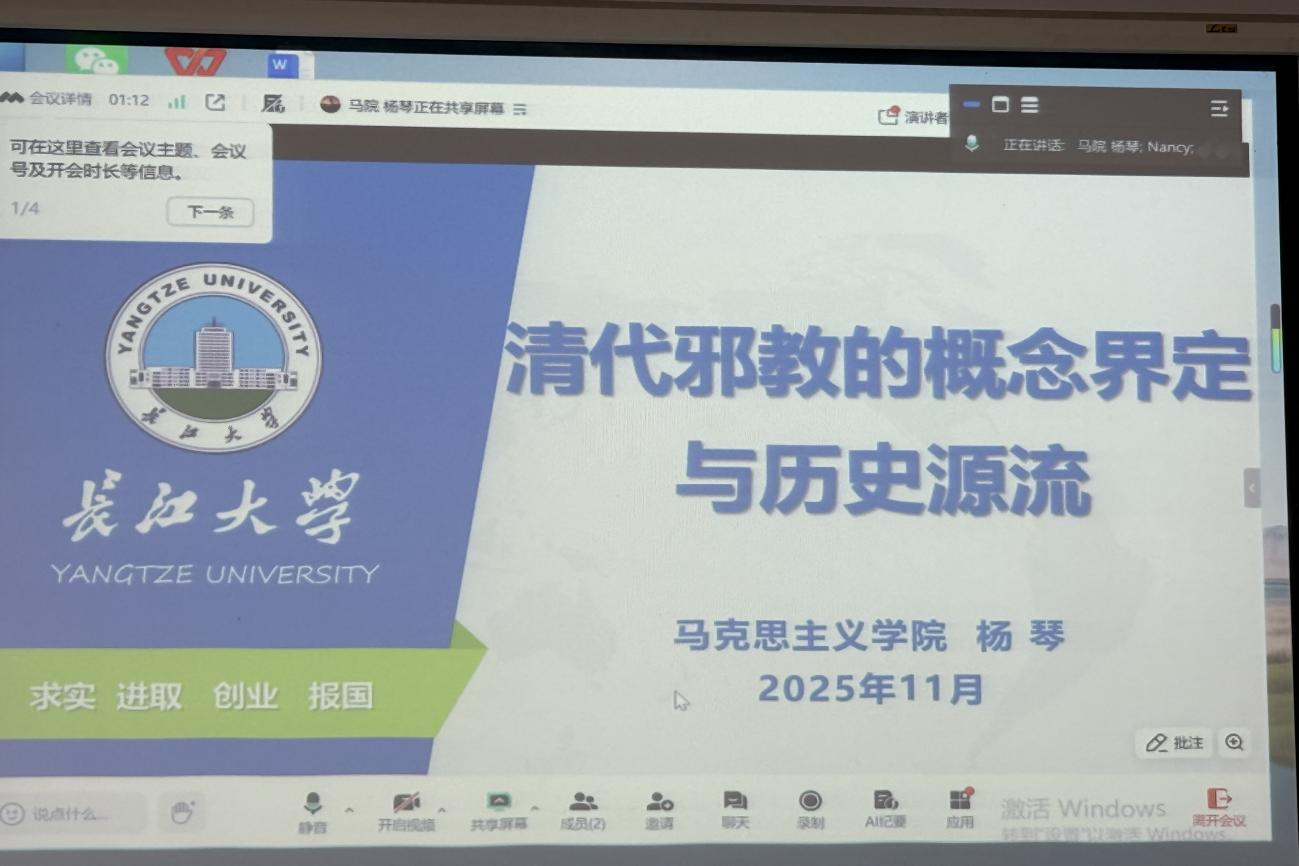 关于清代邪教的概念界定和历史源流,杨琴副教授作了详细的线上报告,她围绕清代邪教的背景脉络与形成原因,首先论证了研究这一课题的必要性与价值——既为理解传统国家治理逻辑提供历史参照,也能为当代社会治理提供历史维度的借鉴。在此基础上,进一步聚焦清代邪教的概念界定与历史源流并展开深入探究。她认为,清代“邪教” 概念并非固定不变,而是随历史发展呈现相对性,且这一概念的核心是为皇权统治服务的政治标识;此外,清代邪教历史源流的演变规律,始终与社会矛盾的起伏、统治强度的松紧及宗教政策的调整存在互动关联。