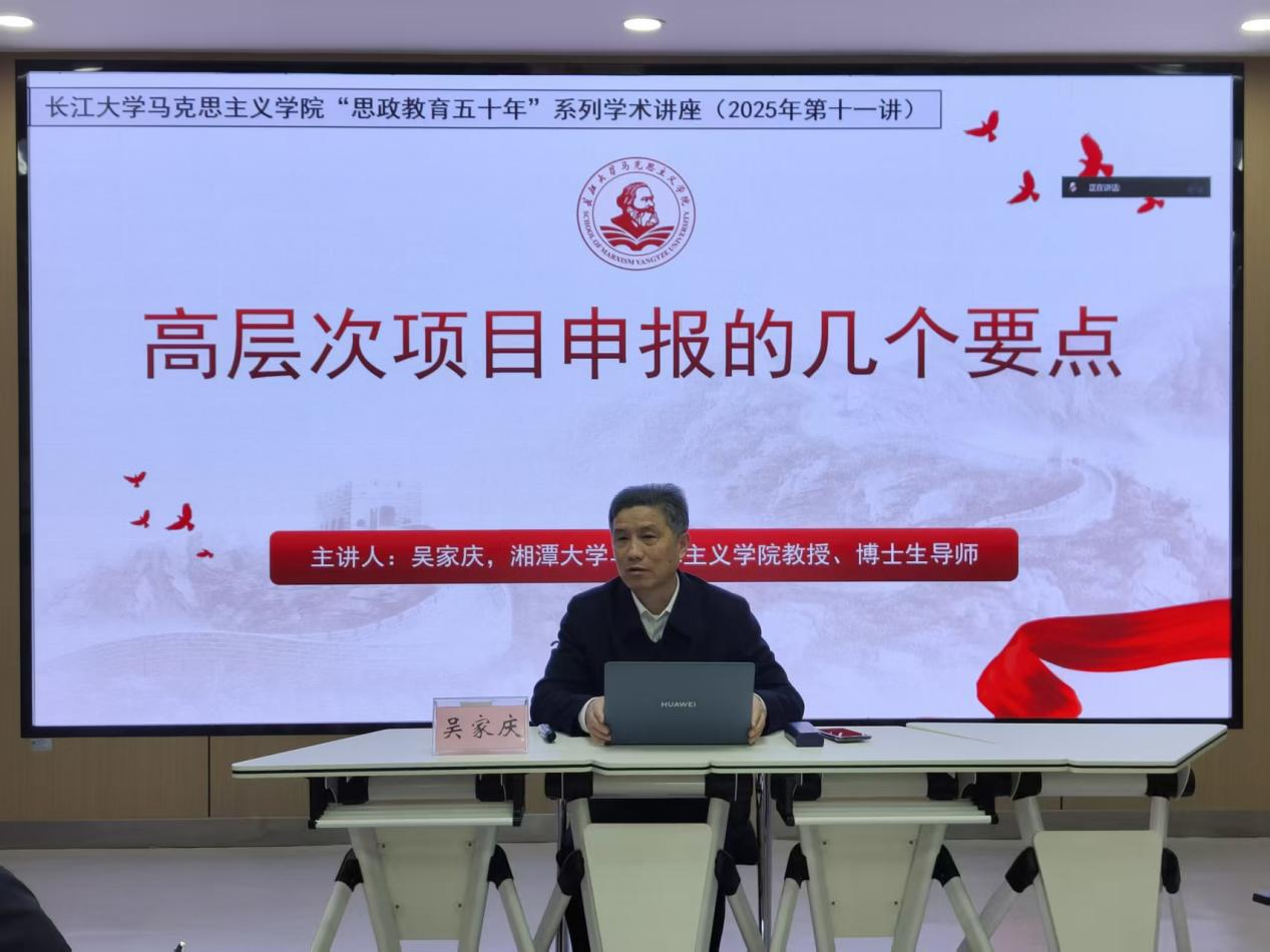 (通讯员 李宁 梁欣然)为进一步提升学院教师申报国家社科基金项目的积极性、主动性,凝聚共识、增强信心,高效推进2026年国家社科基金项目的组织申报工作,2025年12月1日下午,学院在1008会议室举行“思政教育五十年”系列学术讲座2025年第十一讲暨国家社科基金申报专题辅导讲座。本次讲座由中央马克思主义理论研究和建设工程首席专家、国家社科基金马列·科社评审组专家、湘潭大学吴家庆教授主讲,学院全体教师参加了会议。