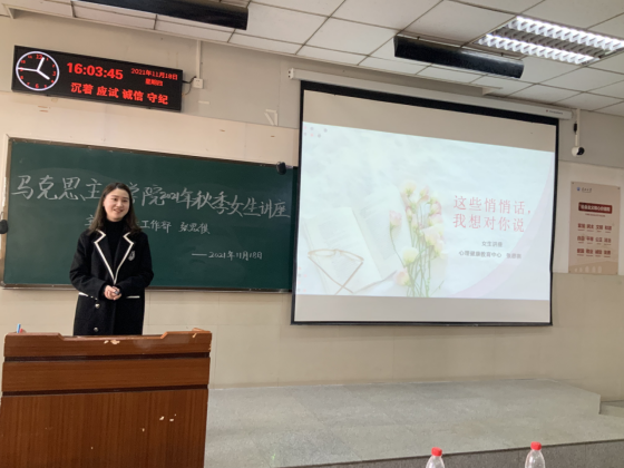 在12教204室举办了2021年秋季女生讲座。学院邀请了学生工作部心理健康教育中心专职老师张思祺主讲,讲座由心理专干张云雾老师主持,全院大一、大二、大三、研一各班全体女生以及其他本、研年级女生代表参会。