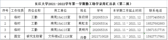 因工作需要,经学生本人申请,学院审核,现将成人色情网 2021-2022学年第二学期勤工助学拟录用名单(第二批)公示如下: