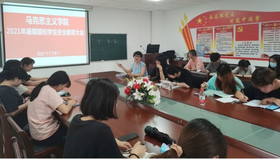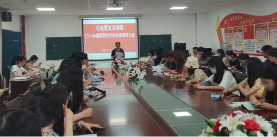 于文科大楼1104召开2021年暑期留校学生安全教育大会,院党委副书记马小佼、学工办主任张云雾及全体留校学生参与本次会议。