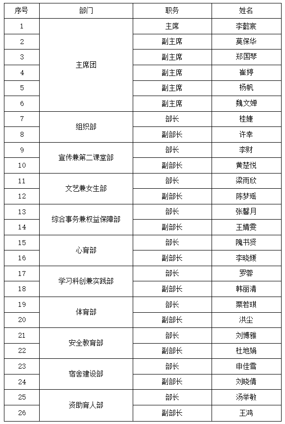 本着公平、公正、公开的原则,经自主申报、资格审查、公开答辩、综合考察等环节,现将成人色情网 第九届团委学生会副部及以上学生干部换届竞选结果公示如下: