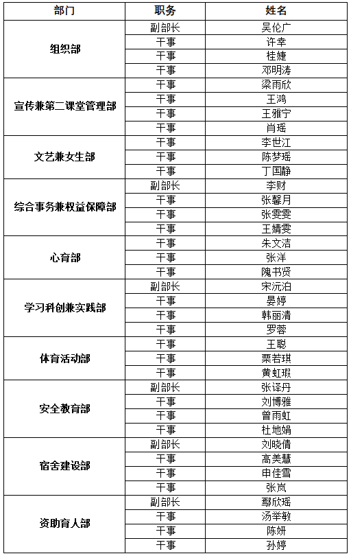 本着公平、公正、公开的原则,经自主申报、资格审查、公开答辩、综合考察等环节,现将成人色情网 第八届团委学生会招新竞选结果公示如下: