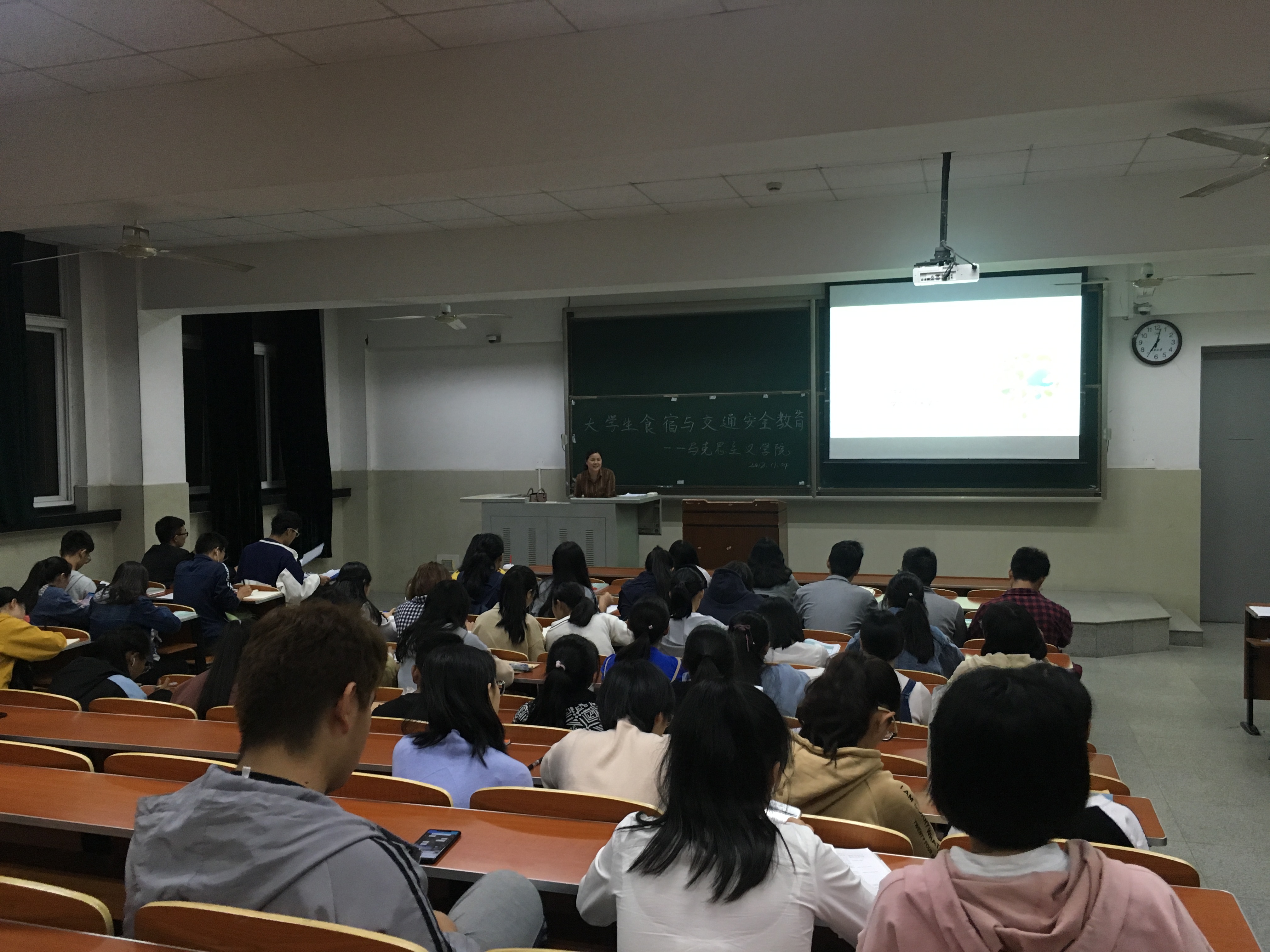 吴老师从个人切身的安全问题出发,在食品安全知识、预防食品安全、正确宿舍用电与预防火灾、宿舍和谐人际关系、校园交通与外出交通安全等方面作出全面讲解,并强调通过安全教育活动形成一种良好的氛围,做到警钟长鸣。在吴老师讲话结束后,张老师结合自身的一些经历再一次强调了食宿和交通安全的重要性。她总结到在安全的问题上,来不得半点麻痹和侥幸,我们必须要防范在先、警惕在前,必须警于思、合于规、慎于行;必须要树立高度的安全意识,人人讲安全,时时讲安全,事事讲安全;必须要筑起思想、行为和生命的安全长城。生命是惟一的,是宝贵的!