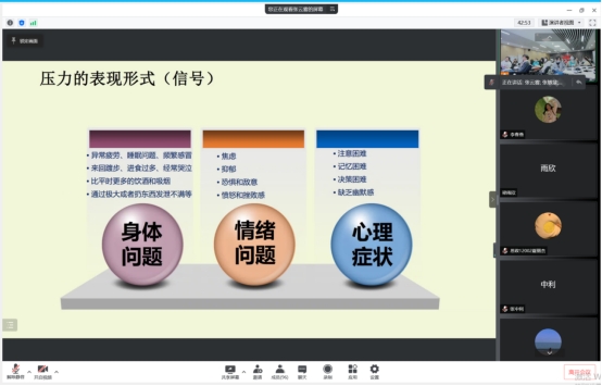 在文科楼1008室开展春季学生骨干心理健康教育培训讲座。本次讲座由心理专干张云雾老师主讲,本研各班班长、团支书、安全委员、心理委员、寝室长等130余人通过线上、线下相结合的方式参会。