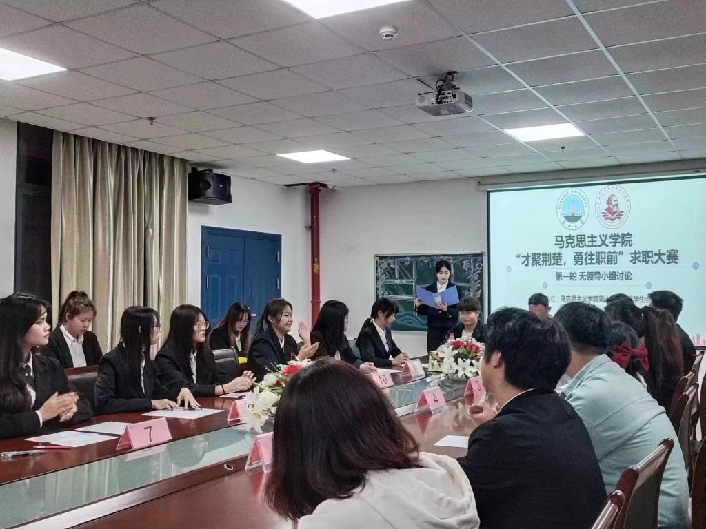 于文科楼1104室举办“才聚荆楚,勇往职前”求职大赛初赛。初赛以无领导小组讨论赛的形式选拔,就业专干李敏、团委学生会负责人王晓彤、郢都论坛负责人张李蔚、修远班负责人李周翊涵、慕晨辩论队负责人陈嘉锐任活动评委。