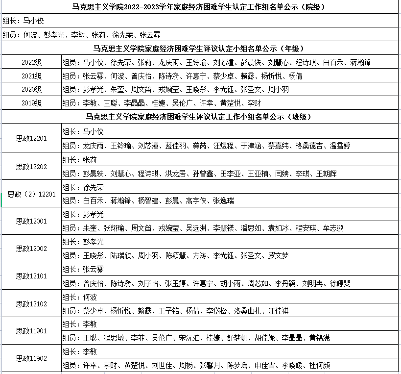 根据成人色情网 学生工作处《关于做好2022-2023学年家庭经济困难学生认定工作的通知》,结合学院实际,现将成人色情网 2022-2023学年家庭经济困难学生认定评议工作组成员名单公示如下: