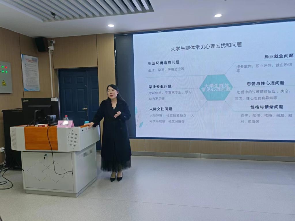 心理专干张云雾老师以《大学生常见心理问题的识别与应对》为题,从“走进心理健康、识别心理问题、学习心理援助和熟悉心理体系”等四个方面展开讲解。她强调了心理健康的重要性,围绕大学生群体的身心发展特点着重讲述了学生中常见的心理困扰。她还结合典型案例讲解了如何识别大学生中常见的精神障碍。作为一名学生干部,怎样进行自助和助人?张老师鼓励同学们扮演好“排雷兵”、“传声员”、“倾听者”和“陪伴者”的角色,遇到困扰要主动寻求帮助,发现危机线索要及时上报,还要学会倾听和陪伴。最后,她还介绍了学校四级心理健康教育工作体系和心理咨询工作安排,呼吁同学们在必要时学会寻求专业的帮助。