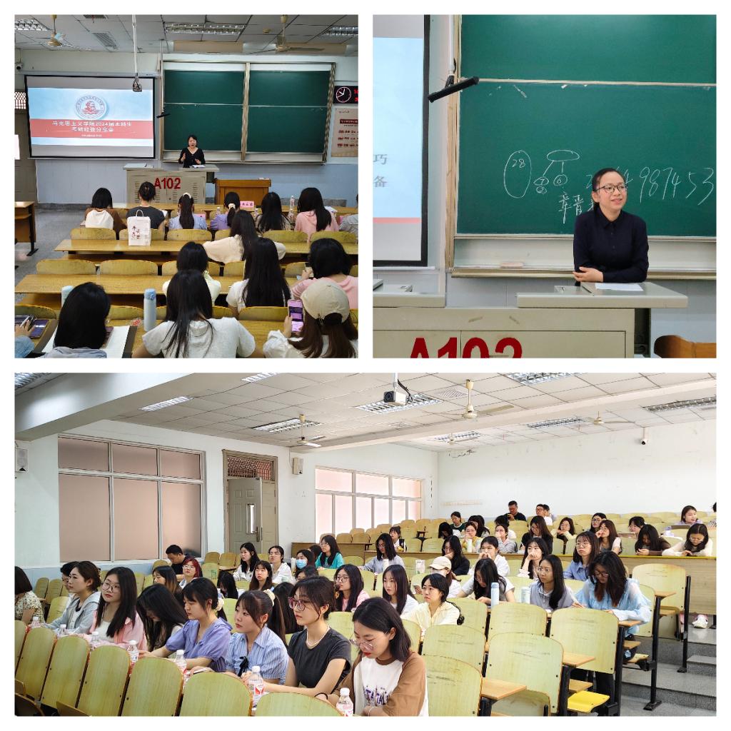 在13教A102室举行2024届毕业生考研经验分享会。学院党委副书记汤慧珍、学工办主任张云雾、2024届考研学生代表以及2025届全体本科生参会,会议由张云雾主持。