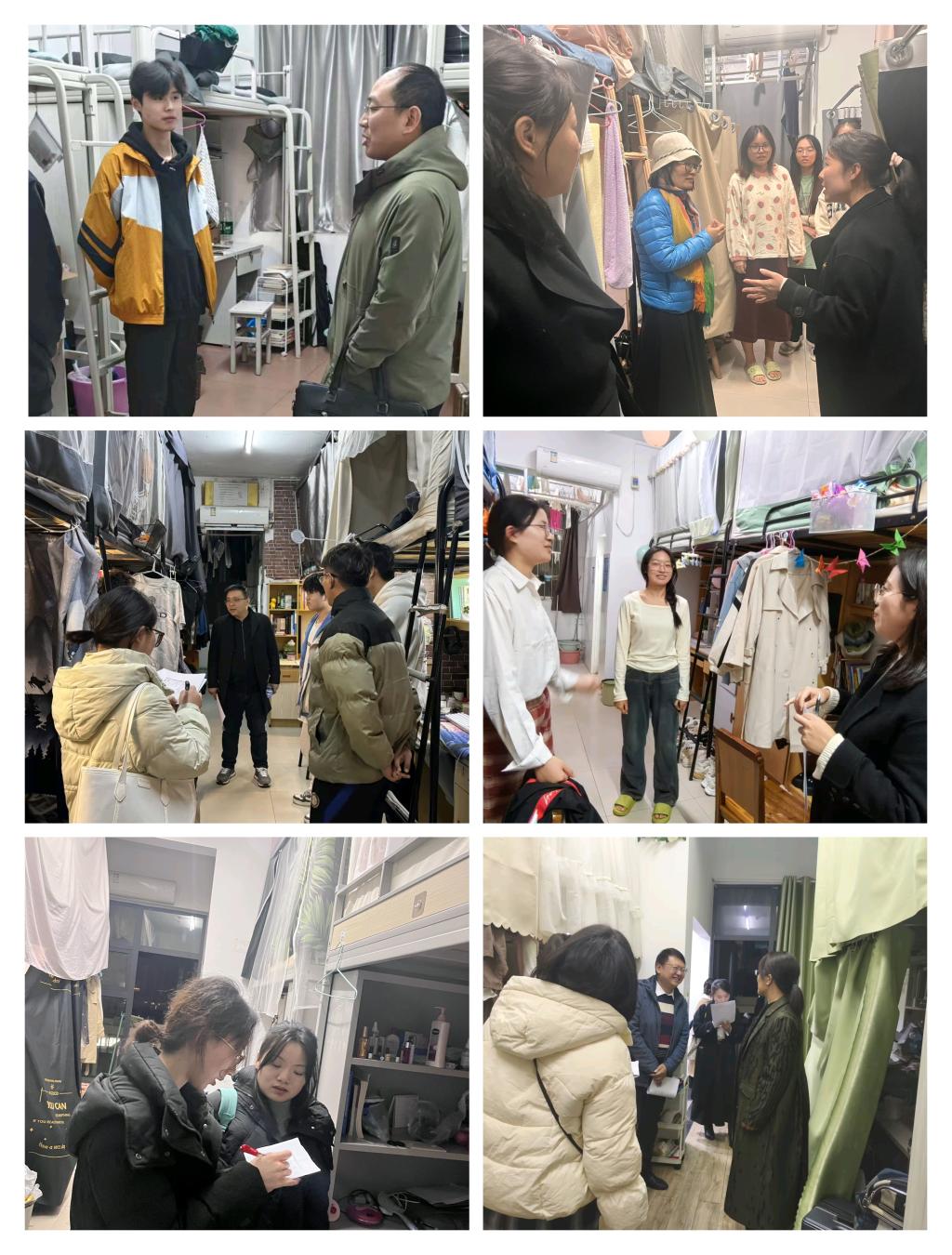 全面开展查寝走访,学院党委书记刘小燕、副院长张莉、副院长涂江波、学工办主任张云雾、全体班主任和兼职辅导员参与走访,深入学生宿舍一线,检查宿舍安全、卫生状况,了解学生生活中的困难需求,传递学院关怀。
