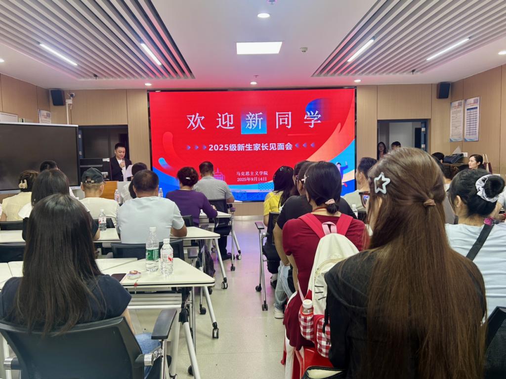 于文科楼1008会议室召开2025级本科新生家长见面会。学院党委副书记竺正海、学工办主任张云雾、新生辅导员邓鹏以及2025级本科新生与家长共同参与本次活动。