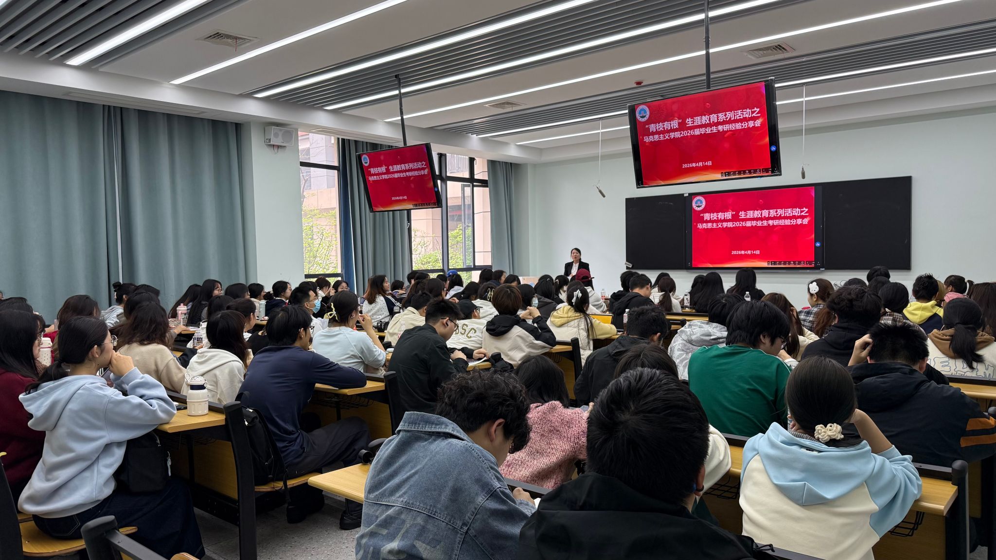 在16教B105室举行2026届毕业生考研经验分享会。活动由学工办主任张云雾主持,温雪婷等考研优秀学生代表分享了备考经验,2023级全体本科生参会。