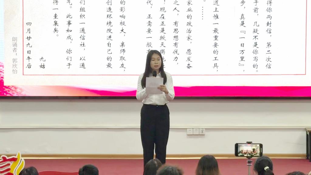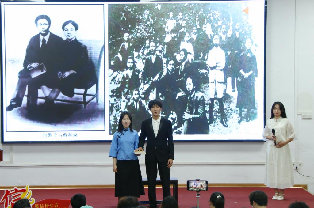 情景演绎环节,杨耀峰、高宇桐、王羿茹三位学员深情演绎了蔡和森和向警予赴法求索、寻求革命真理的故事,从时空对望到异国求学,从道路探索到希望萌芽,情景交融,带领在场师生重走蔡和森、向警予的赴法初心之路,开启心灵觉醒与成长之旅。