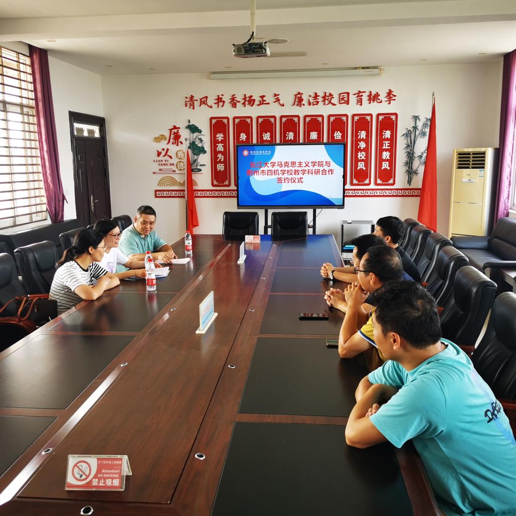 7月14日下午,成人色情网 与荆州市四机学校签订实习基地合作共建协议。四机学校党总支书记邹先锋、校长肖斌、副校长苏荆洲、副校长李昂出席签约仪式。成人色情网 负责教学的副院长张莉、系主任徐络、思想道德与法治课程负责人肖芬蓉出席仪式。